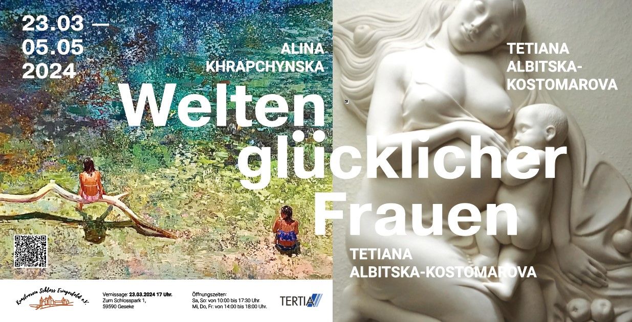 TERTIA Paderborn: Unter dem Titel „Welten glücklicher Frauen“ findet vom 23.03. bis zum 05.05.2024 auf dem Schloss Eringerfeld in Geseke eine gemeinsame Ausstellung der Künstlerinnen Alina Khrapchynska und Tetiana Albitska-Kostomarov statt.